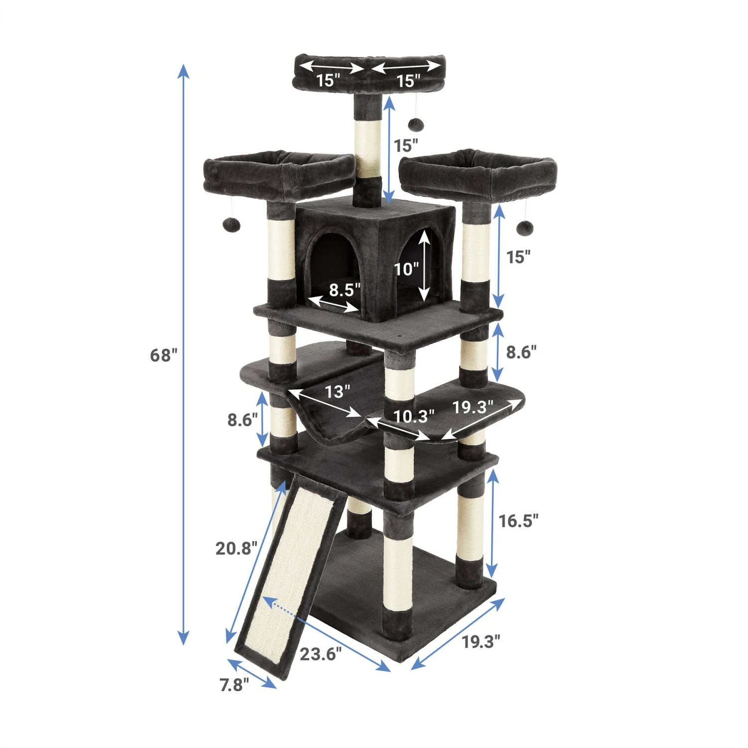 Take your cat tree game to new heights with this tall, plush cat tree from Frisco by Chewy. It has everything your kitty needs to play, scratch and lounge. That’s one private condo, three top perches—each with a removable, machine-washable bolstered perch cover—a plush hammock, sisal-wrapped scratching posts, a sisal scratching ramp, and fuzzy balls for some batting fun. The plush fabric throughout feels soft to the touch and adds a luxurious, velvety look. Imagine all the purring possibilities! Your cat will love snuggling in one of the bolster beds at the top or the cozy hammock. Crafted with décor-friendly neutral hues, this is one cat tree you’ll want to show off.