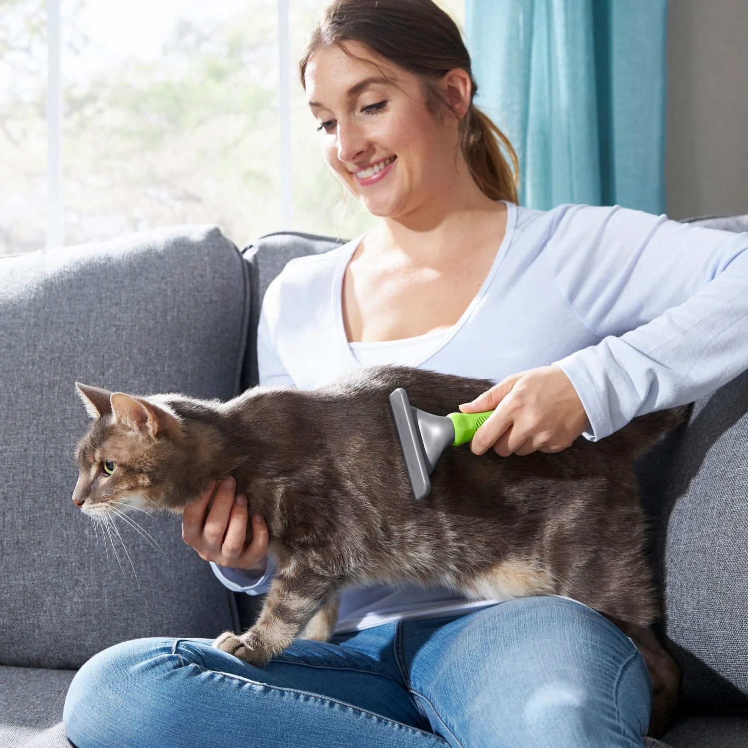 Frisco Deshedding Dog & Cat Brush, Large, Short to Medium Hair—The Frisco Deshedding Pet Brush blasts away those furry tumbleweeds around the house! With a 4.5-inch stainless-steel blade built for durability, angled tooth design and ergonomic handle, this deshedding tool is great for tackling tough tangles and knots in your dog or cat’s coat while helping to reduce overall shedding of dead, loose hair. Plus, it has a lightweight, ergonomic handle with a soft, non-slip grip to help you stay comfortable and in control during grooming.